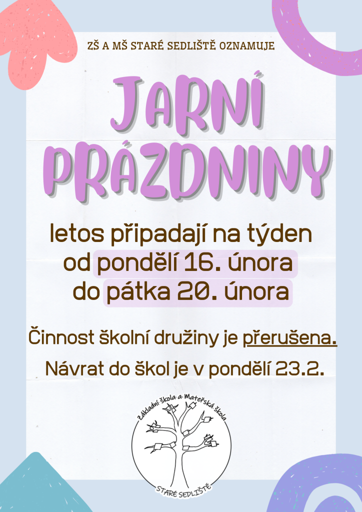 Od pondělí 16. února do pátku 20. února máme jarní prázdniny. Činnost školní družiny je v těchto dnech přerušena. Návrat do škol je opět v pondělí 23. února.