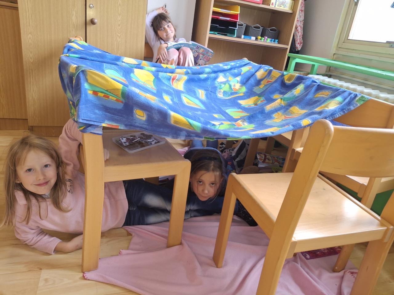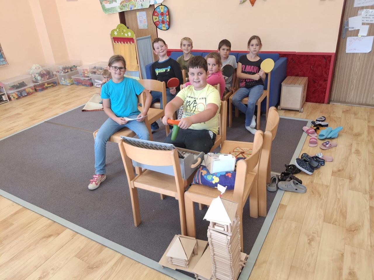 V družině si děti zkouší různé hry – postavily vlak a cestovaly po světě, stavěly domečky a hrály si na rodinu, a také si užily pohyb při pinkání míčkem s pálkami.