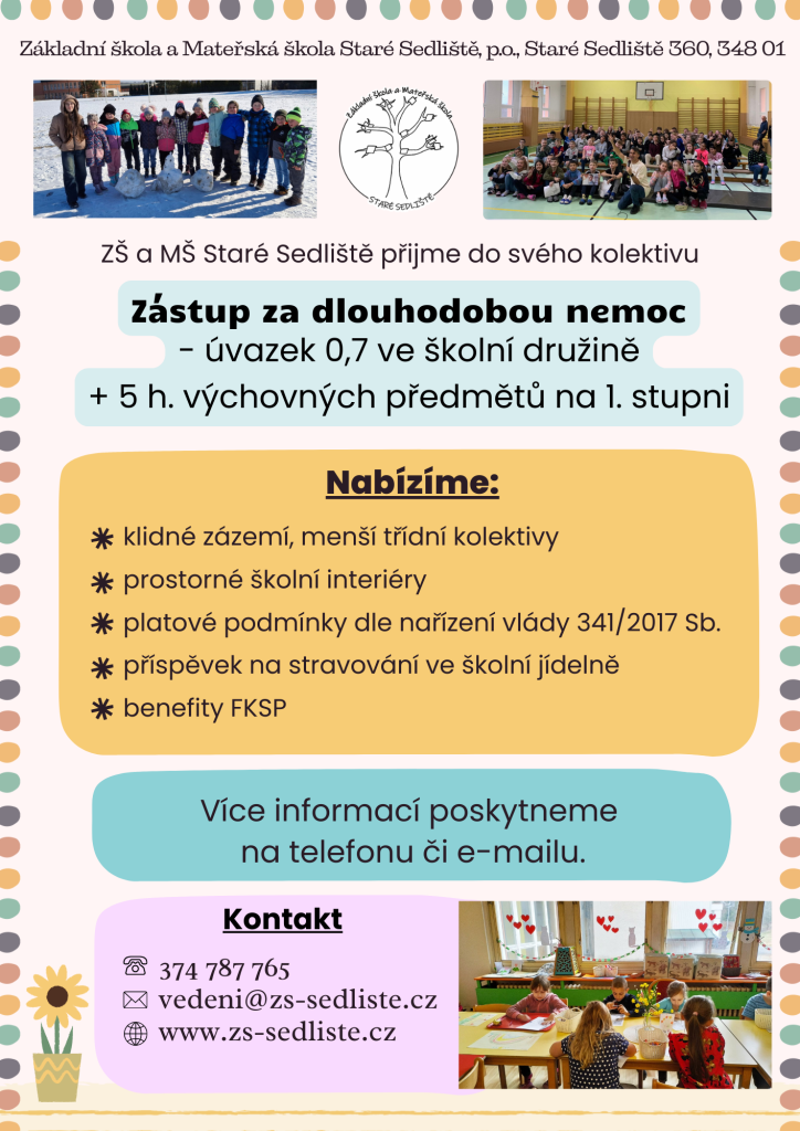 Do našeho kolektivu přijmeme učitele na celý úvazek a zástup do školní družiny za dlouhodobou nemoc. Více informací na letáčku nebo u vedení školy.