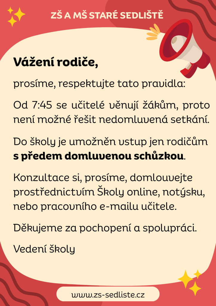 upozorňujeme, že do školy budou vpuštěni pouze ti rodiče, kteří mají předem domluvenou schůzku s vedením školy či konkrétním pedagogickým pracovníkem. Pokud někdo přijde bez předchozí domluvy, nebude vpuštěn. Bude odkázán na možnost domluvit si schůzku jinou cestou. Také rodiče, kteří ráno požadují okamžitý rozhovor s učitelem, budou vždy odkazováni na domluvení termínu – učitelé se od 7:45 věnují žákům.