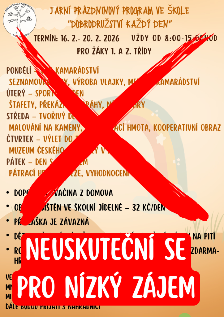 Z důvodu nízkého zájmu se jarní prázdninový program ve škole s názvem "Dobrodružství každý den" neuskuteční.