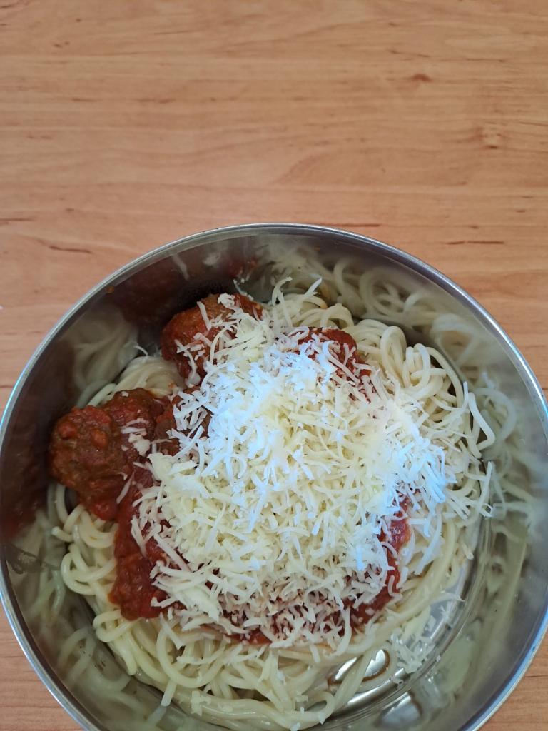 Jako první jsou na jídelním lístku masové koule v rajské omáčce, špagety, sýr.